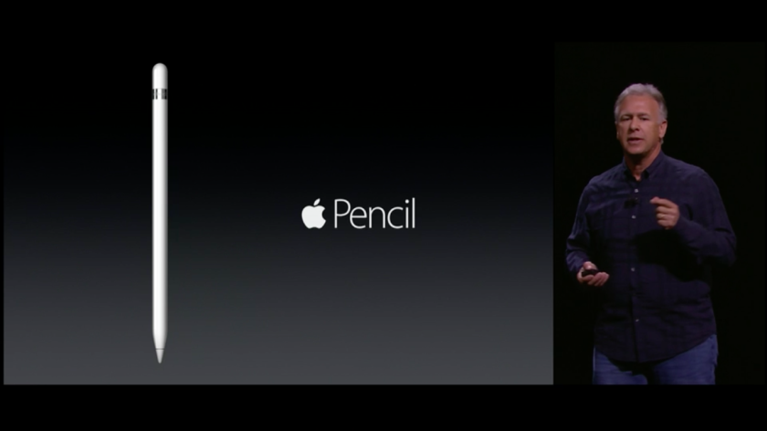 The rumored stylus exists, and its dubbed the Apple Pencil. It emits signals from two locations to make shaded strokes, and the system scans twice as fast to capture them. It recharges off the Lightning connector, which plugs right into the tablet. Rather than pressure, it tracks tilt and pressure, which one-ups most iPad styluses, Apple claims it's more precise, and it's supported by many apps out of the box.