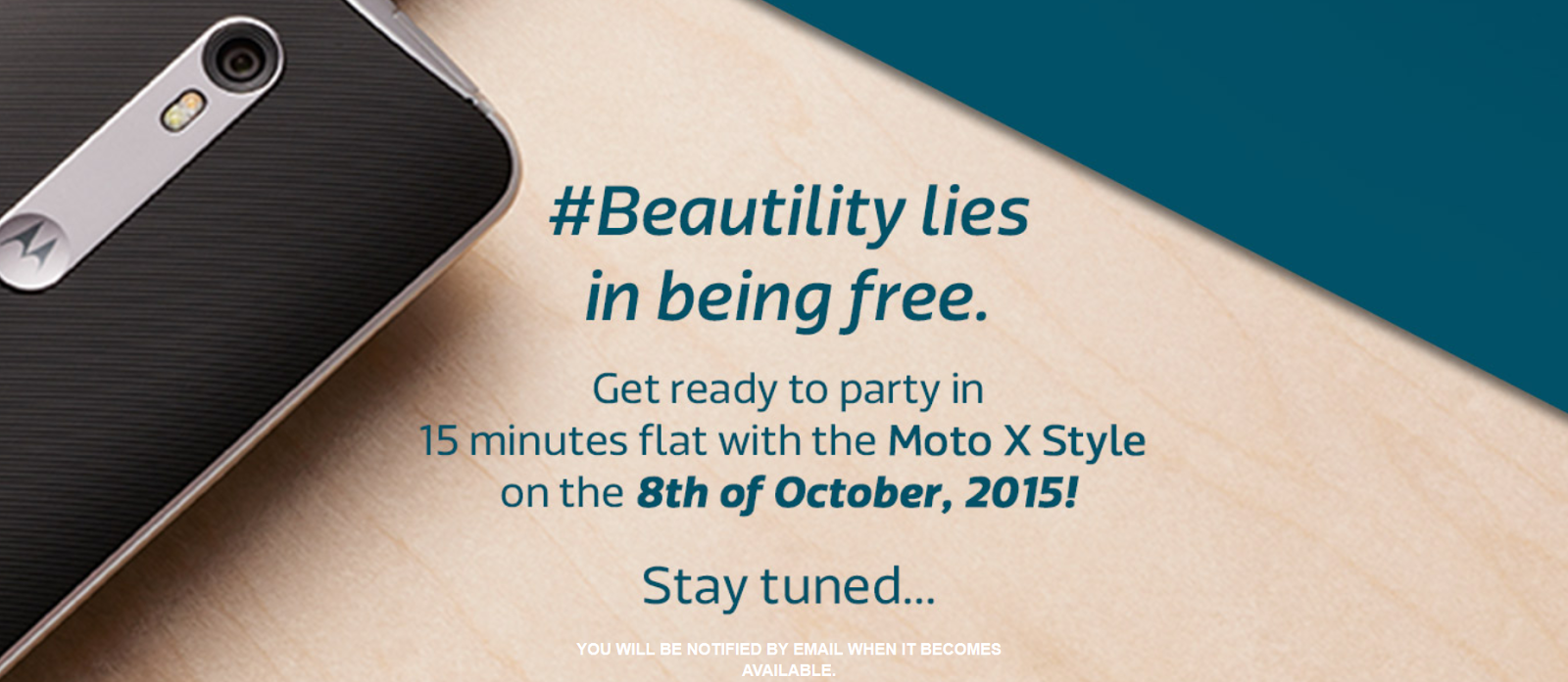 The teaser mentions “#Beautility lies in being free. Get ready to party in 15 minutes flat with the Moto X Style on the 8th of October,2015!” However, the page does not share details regarding price. Interested users can send in their email address and will be notified regarding the update.(Well, I surely have!)